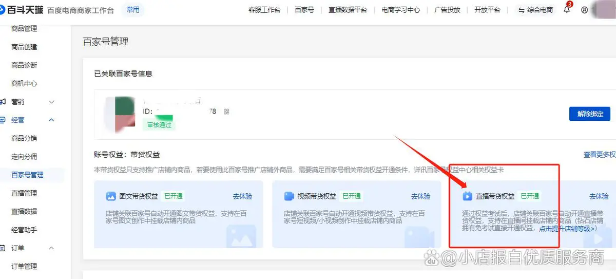 第四步:店铺审核通过后,缴纳对应的保证金,同步店铺关联百家号,开通直播带货权限,然后提交开通闪电购和无人像提示报备即可。