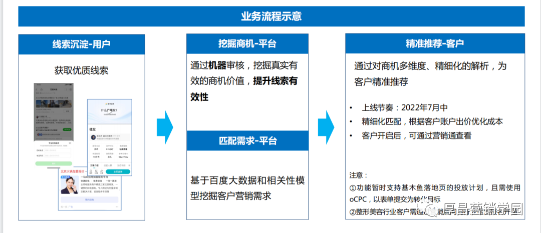 简单来说,就是百度会以平台的身份收集优质线索,将线索进行过滤,然后再把筛选后的高质量线索分发给符合其定向需求的客户。