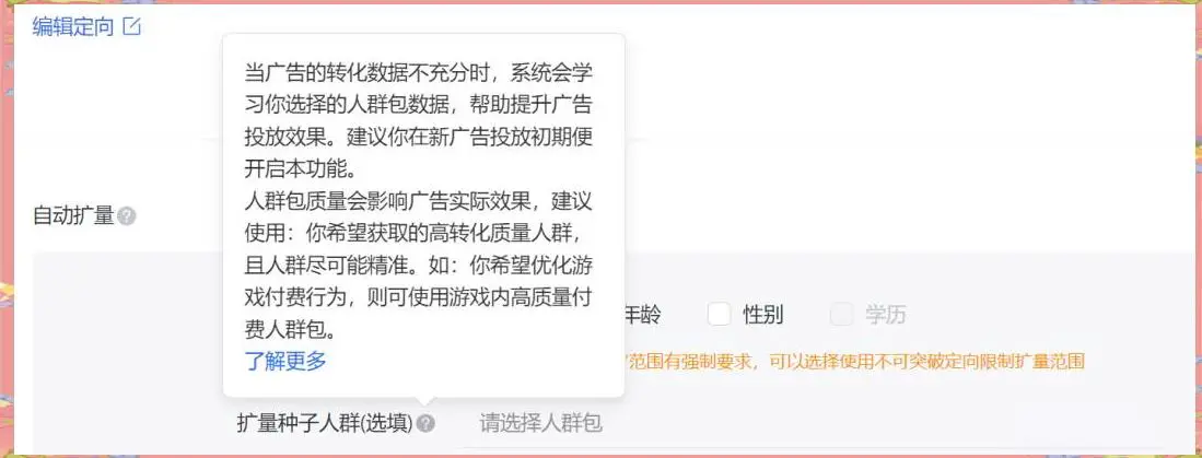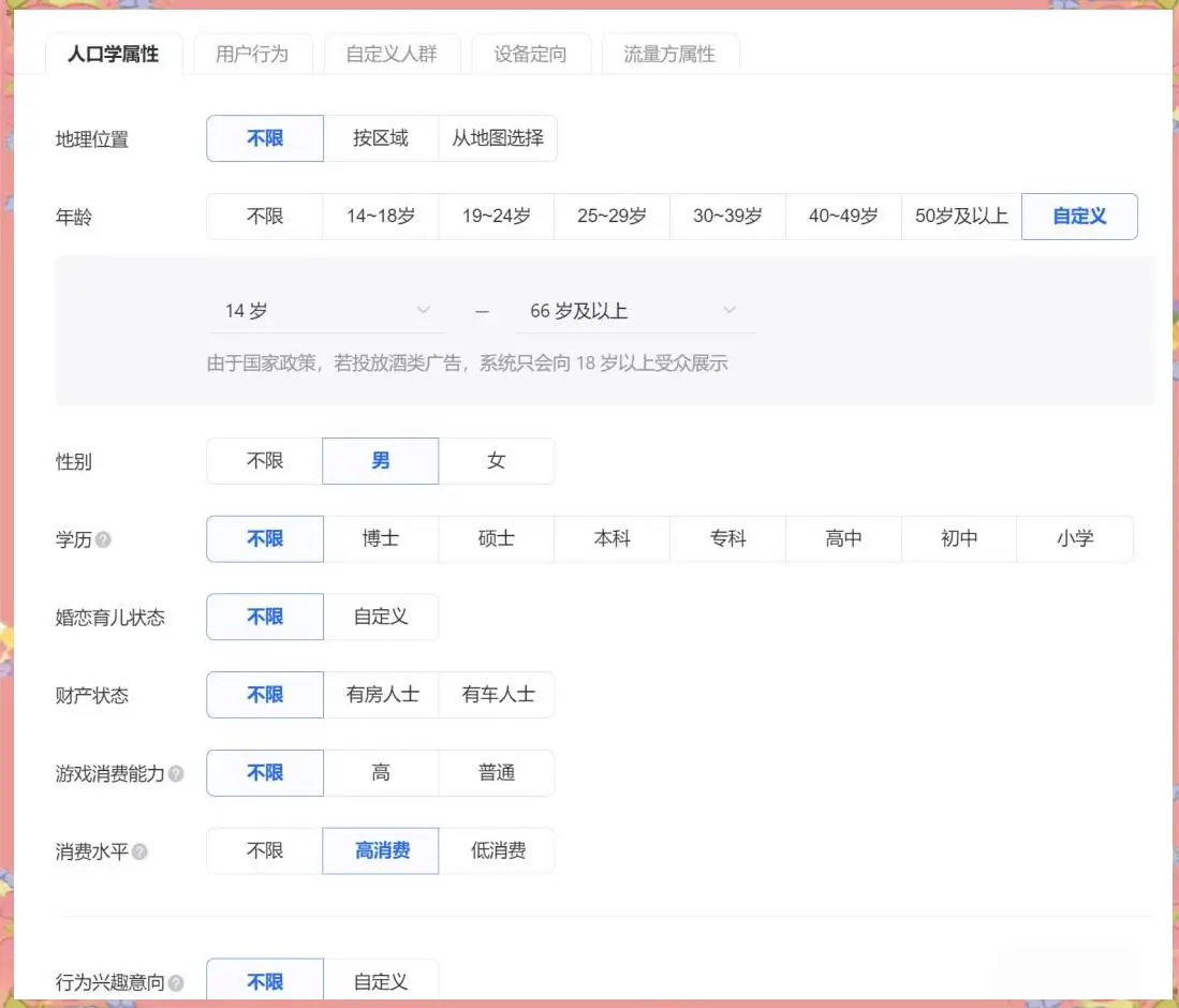 通过定向配置,我们可以将广告精准地投放给符合特定标签的用户。在实际操作中,定向人群包也是一种常用的投放策略。以游戏广告主为例,他们可以利用历史数据,筛选出那些有过正向行为的用户,如频繁登录、有付费记录、游戏时长长以及装备丰富等。基于这些数据,广告主可以生成一个包含这些用户设备ID的人群定向包,并按照媒体的要求进行格式化处理后上传。在广告投放时,媒体会依据这个定向包,对这部分用户进行广告定向曝光,或者利用媒体自身的扩量功能,找到更多具有相似特征的用户。