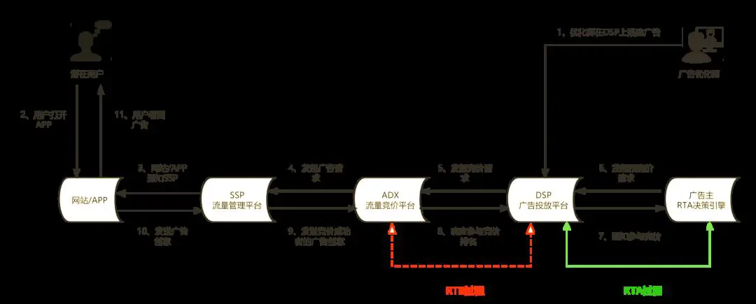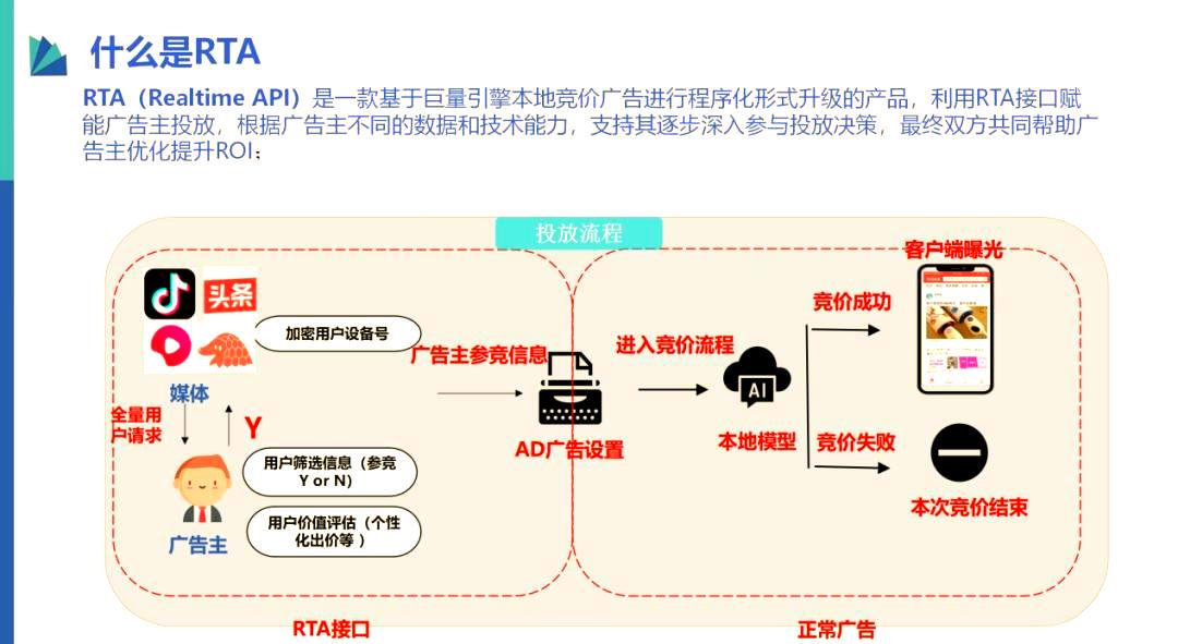 RTA,即实时广告API(RealTime API),是一种广告技术,其核心在于广告平台与广告主之间的实时交互。在广告检索阶段,广告平台会通过RTA接口主动向广告主询问其广告是否愿意参与竞价。一旦广告平台接收到广告主的回应,便会根据这些信息进一步进行广告检索和召回。