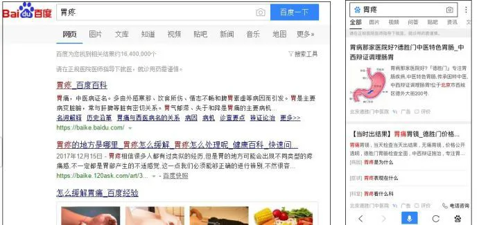 (左右图分别为电脑端和手机端“胃疼”关键词搜索结果)