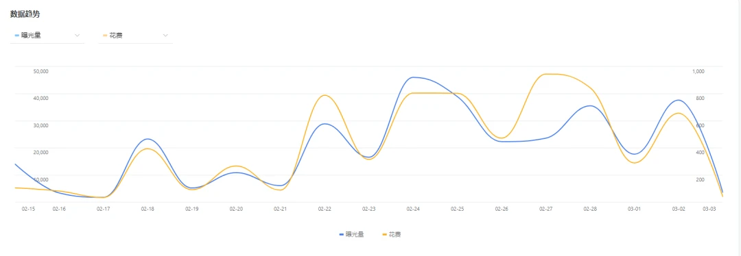 2月15号开启投放后,前期数据模型测试两天后,在2月18号效果出现上升趋势,在2月19号不断优化调整下,数据逐渐上升且比较稳定,在3月2号后账户余额不够充足,部分广告出现衰退状况,逐渐下降。