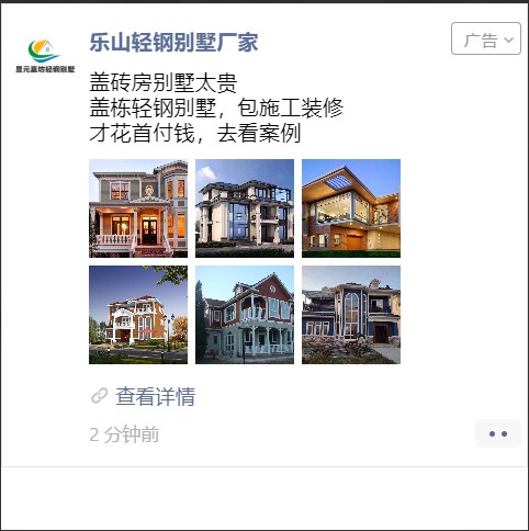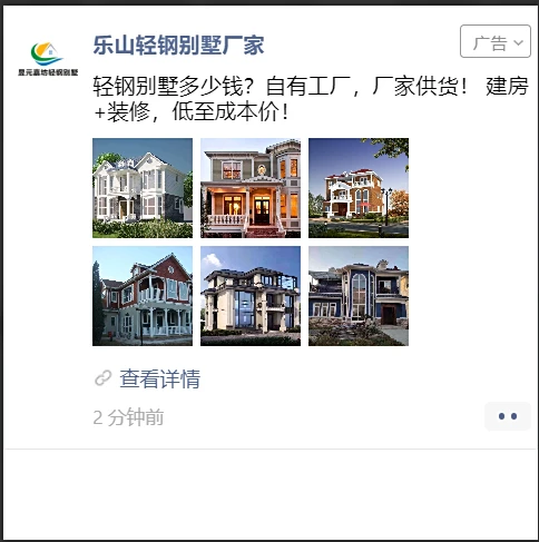 在外层图的选择上有更换过多版本,还是六图的效果会更好些,点击率呈上升趋势,外层的案例展示也更吸引受众群体点进落地页查看,同时落地页里面介绍轻钢别墅的优势,通过报价来吸引客户留下资料。