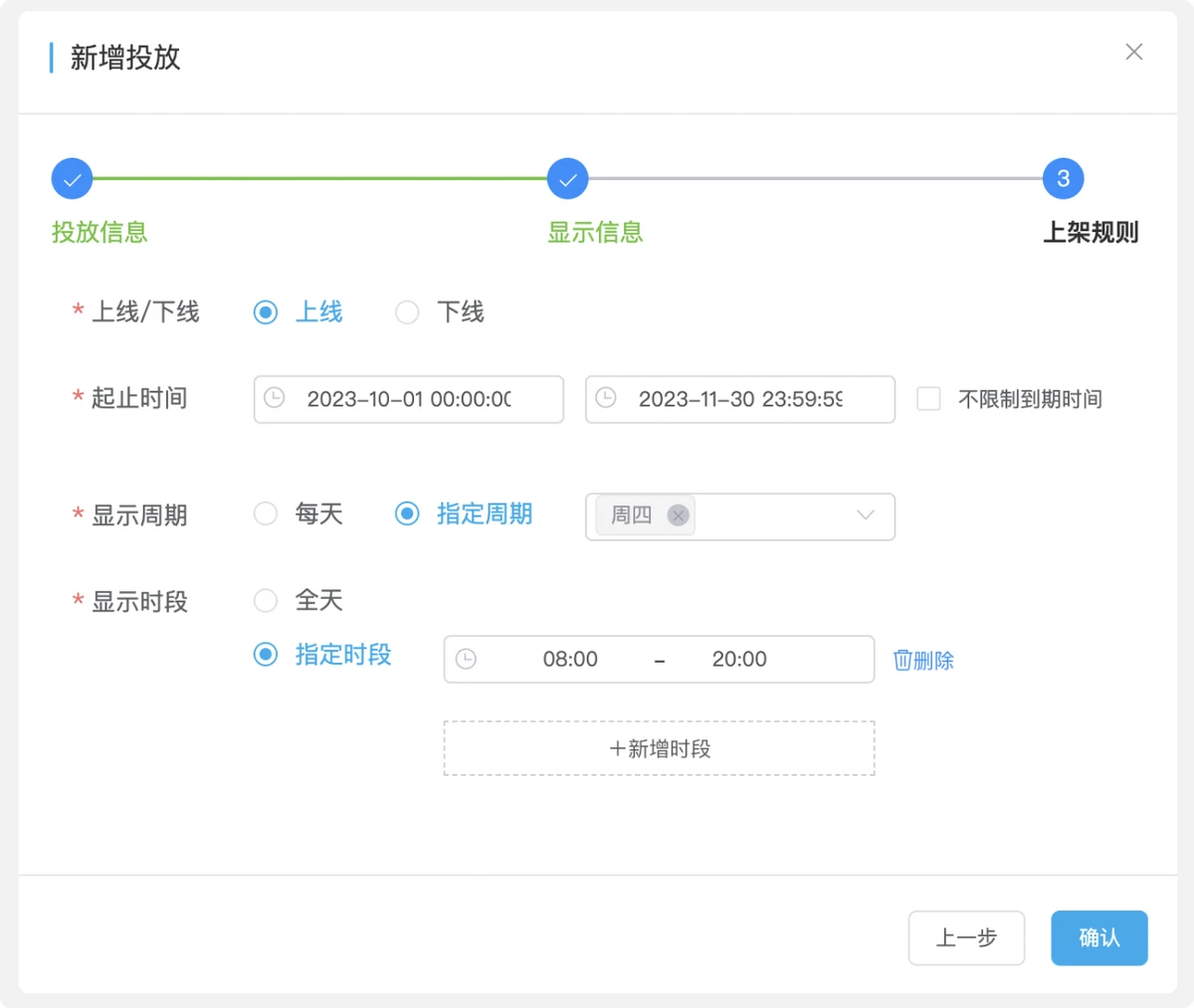 初始状态为上线,投放的起止时间是 10-11 月,只在周四的 8:00-20:00 进行展示。