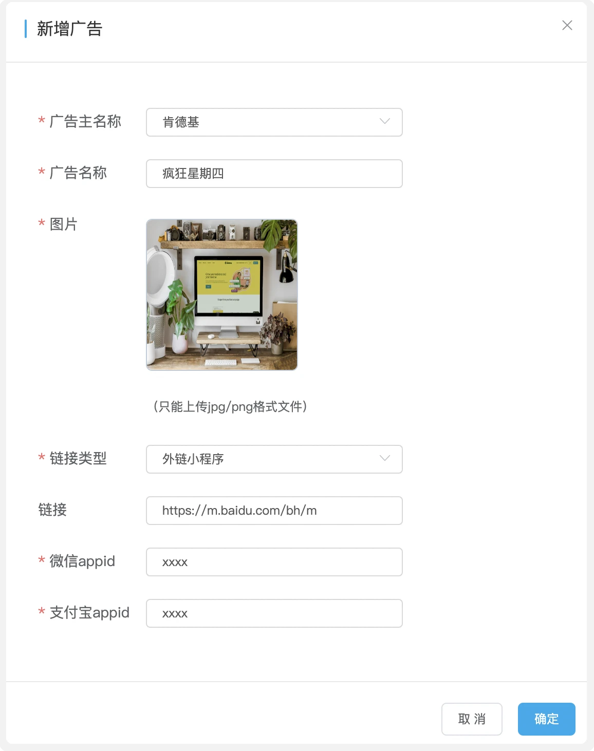 创建广告,首先选择此广告所属广告主,再进行广告字段的填写。广告名称填写疯狂星期四,图片上传宣传图,链接类型为外链小程序,输入对应的URL 和 appid。