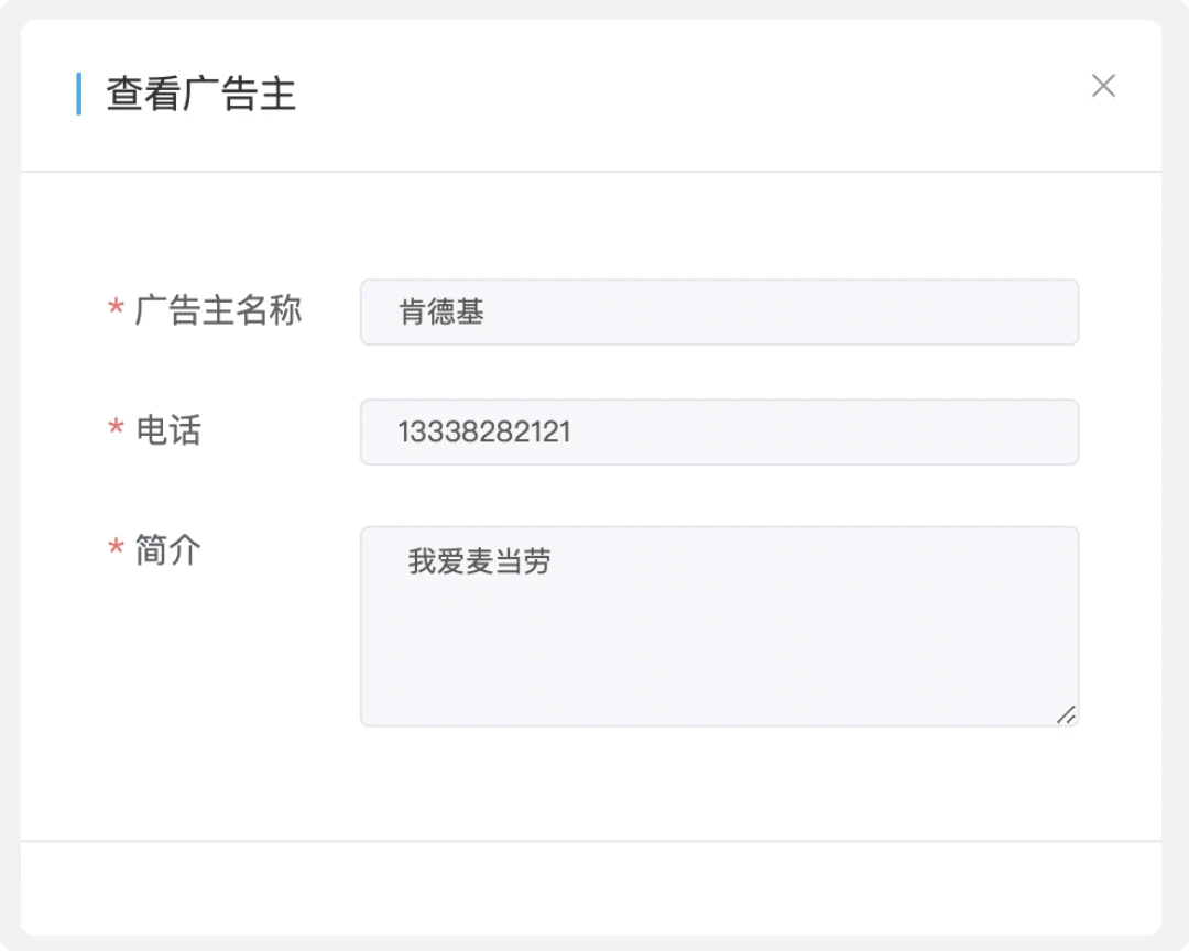 - 广告主创建这个步骤可以由公司内部运营人员进行,也可以由广告主方自己进行,这取决于需求以及系统设计。一般来说,初级的投放只需要在系统内部自己进行创建即可。但是一旦体量大,广告主的创建就必须开放给甲方,由甲方进行申请,运营进行审核。与此同时,广告的创建、投放等等步骤都需要配合变更。且会涉及广告审核、广告资源售卖、广告策略等等内容。本文描述的是初级广告投放的创建过程。