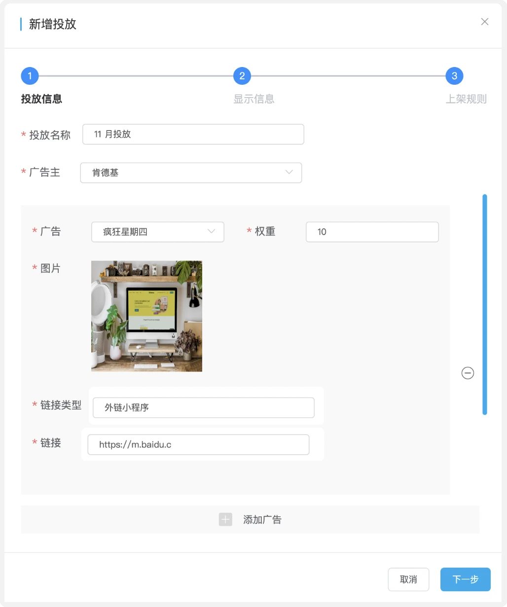 广告的基本字段有:所属广告主,广告名称,宣传图,链接类型等等。