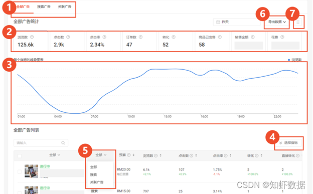 在Shopee广告页面中,您可以查看广告数据效果来确认您的广告是否有效,下面以全部广告页面为例: