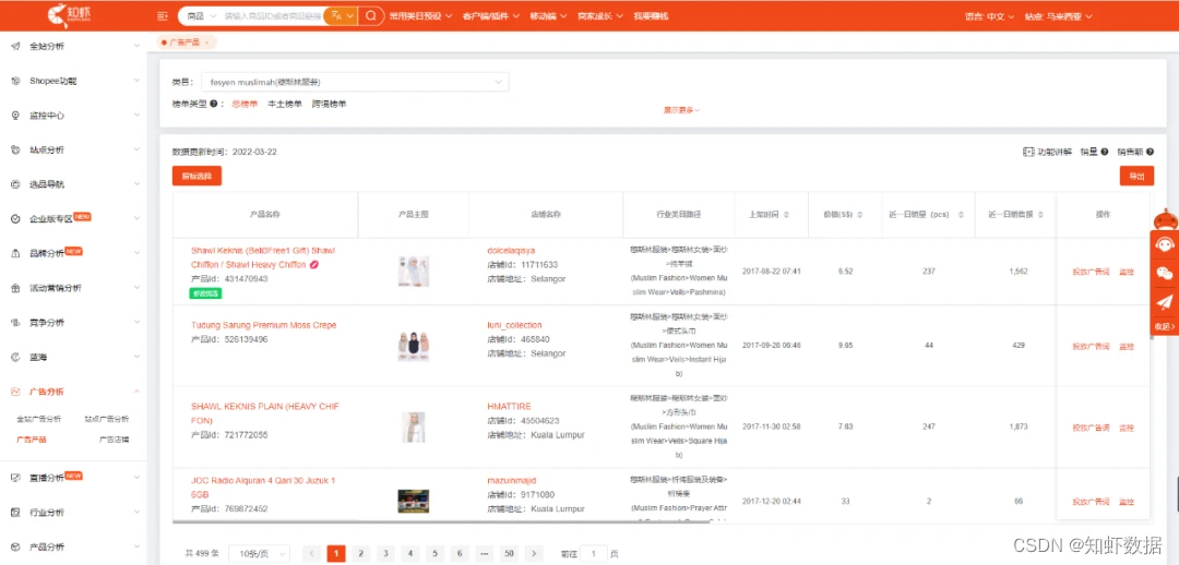 从「知虾数据-广告分析」可以实时查看广告产品销售数据,从广告产品数占比、广告产品销量占比等方面,全面分析广告产品引流效果,助力用户精准投放产品广告,提高转化率。