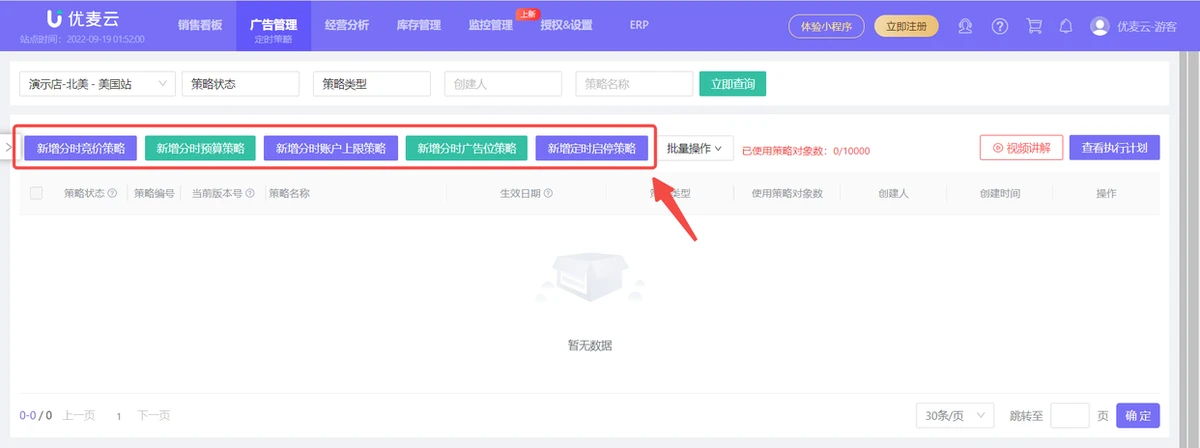 广告定时策略,是优麦云系统独有的功能,可以帮助卖家定时投放广告,更加精准花费,将钱用在刀刃上。