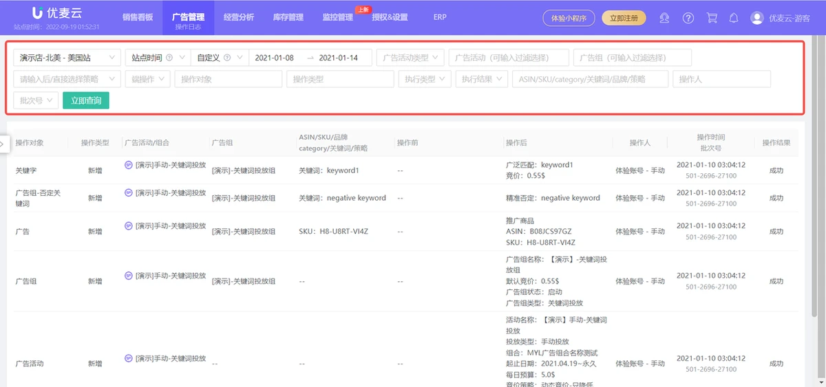 同步保存在优麦云系统中所有的广告调整记录,可以帮助卖家分析广告优化效果,包括对应操作人、操作结果,帮助卖家更好地维护广告投放。