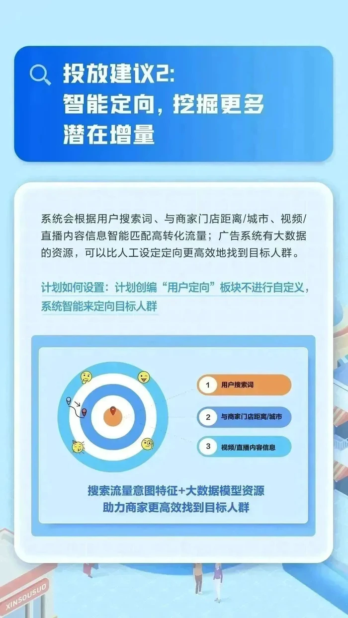 在“智能定向”模式下,系统会根据用户搜索词、与商家门店距离/城市、视频/直播内容信息智能匹配高转化流量,能够比人工定向更高效地找到目标人群,帮助商家挖掘更多潜在增量。