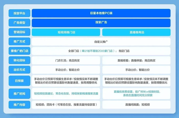 此外,建议在投放时选择默认团购卡+短视频双投,可以有更多流量位承接,带来更多跑量,同时团购卡体裁作为搜索流量下的独有体裁,也可以帮助商家降低素材门槛,适合商家持续在投,常态承接心智人群流量。最后再给大家划个重点,“短视频推门店”及“直播推商品”的操作路径图如下,建议收藏并按需使用: