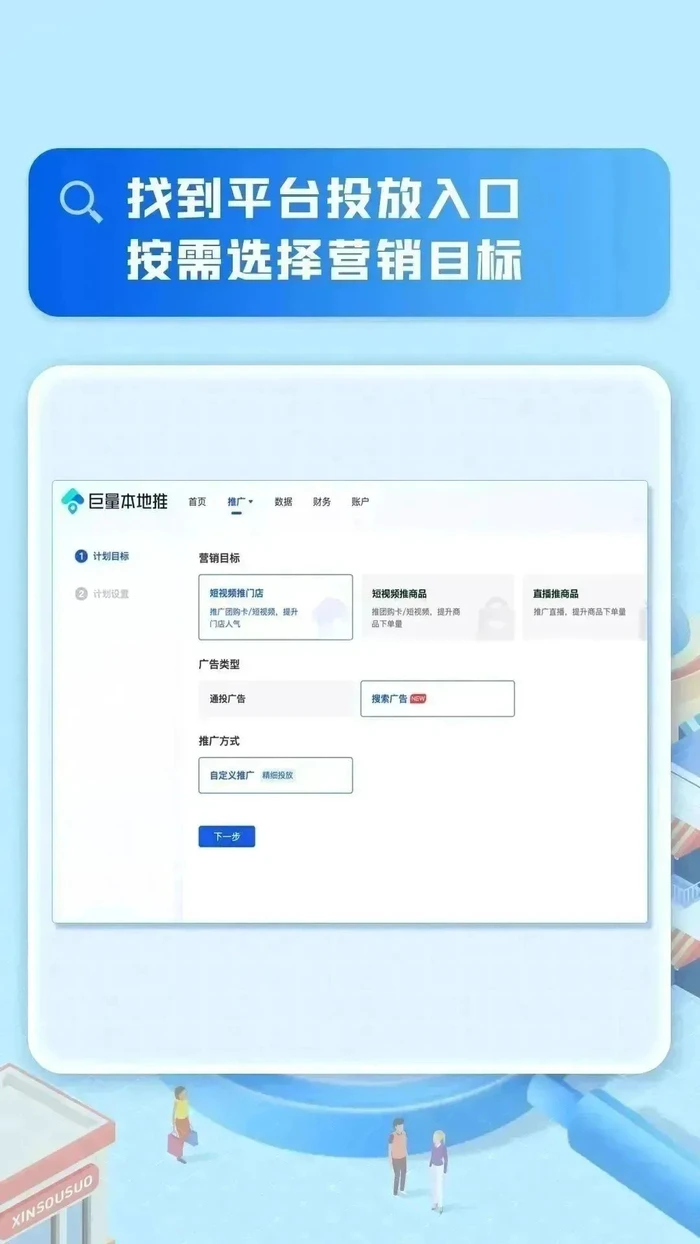 进入本地推→“推广”页面,看到“搜索广告new”即代表账户可以投放搜索广告,按营销目标选择短视频推门店、直播推商品,推广方式需选择“自定义推广”。