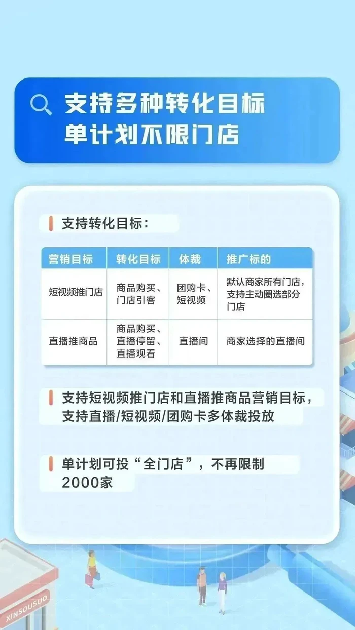 此外,「搜索广告」还支持多种营销目标和投放体裁,商家可以自行选择由团购卡、搜索推荐、直播间、挂poi短视频等载体承接搜索流量,以达成门店拉新、直播间引客、门店经营等各类营销诉求。由于「搜索广告」具备精准获客、高效促转等优势,商家可尝试对短视频(包括团购卡)与直播间进行常态化投放,进一步激活搜索行为人群的潜在价值。