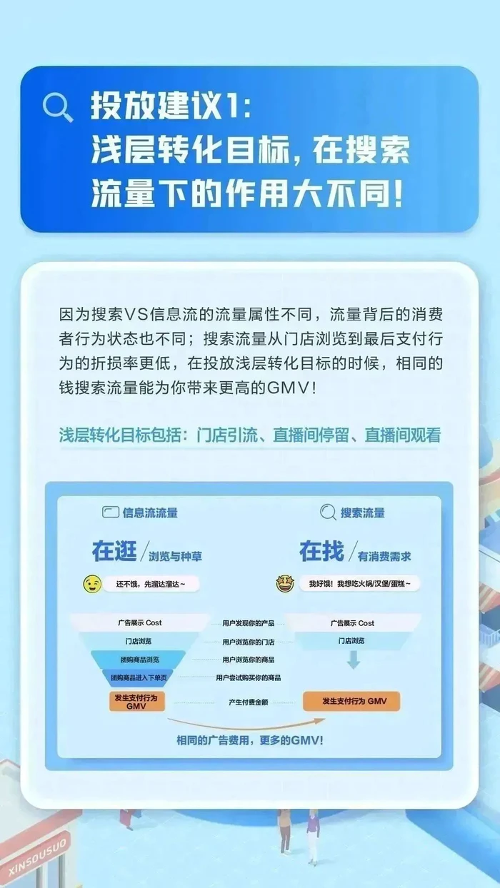 由于搜索广告为商家匹配了意图更强的用户,整体过程中用户流失率更低,在投放浅层转化目标的时候,和信息流流量相比,相同费用下搜索流量能够带来更高GMV。