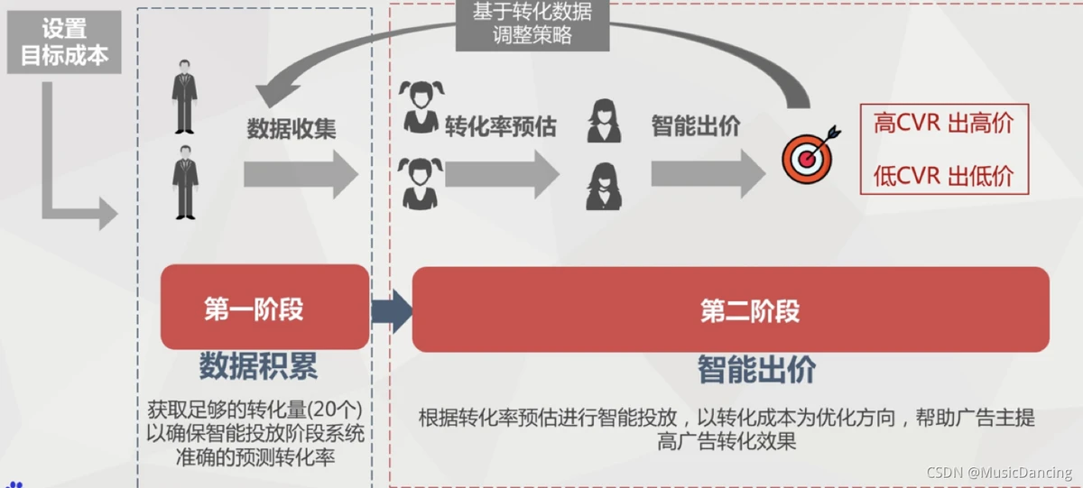 当广告主投放信息流广告后,经过一段时间的数据积累,可确保智能投放阶段系统的预估转化率时,系统会根据您的转化情况,进行优化出价。OCPC的出价方式分两个阶段,前期精准后期宽泛和直接选择宽泛。