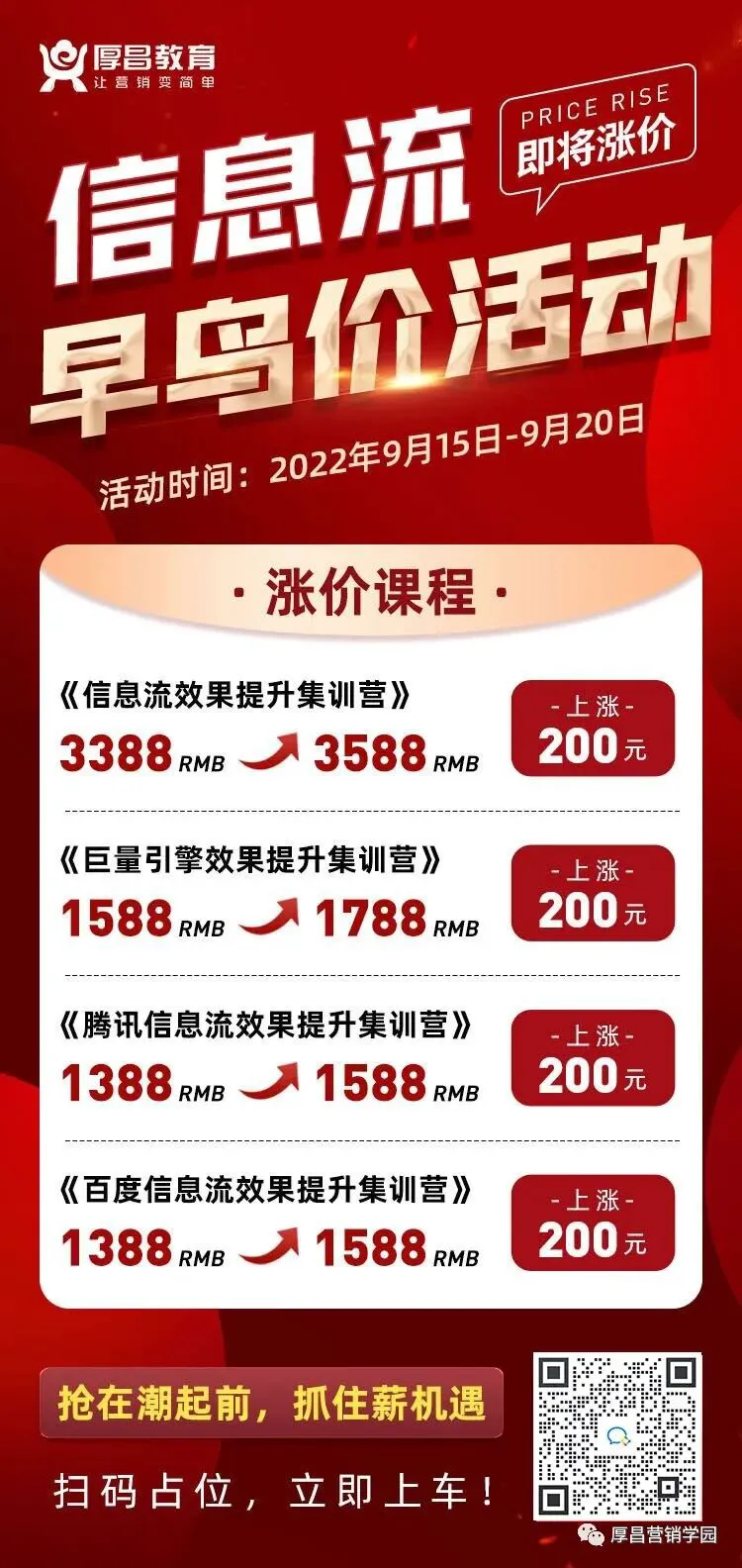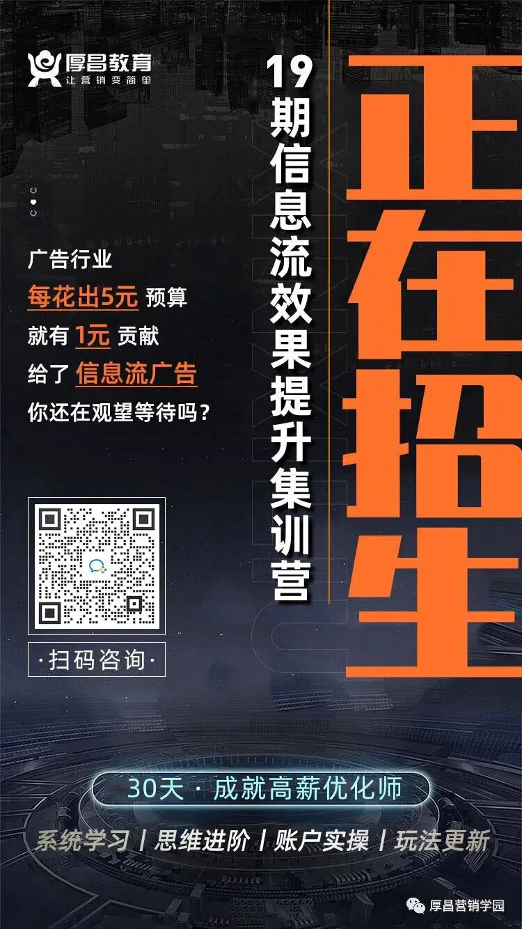 我们一起来了解一下一个拥有高薪工作的优化师需要哪些能力,然后一起查漏补缺,增强自己的能力。因为我们是有广告投放后台。如果给你一个账户,你都不知道如何去操作、设置,那么我们最基础的能力是不能达到要求的。正如柯楠老师所说的,一个好的课程只能解决你30%的问题;剩下的50%是需要在实操中配合课程的内容不断地探索出来的,总结成自己的知识;剩下的20%是把自己的东西再进行磨练,提炼出适合自己账户的经验。由此可见实操的重要性,如果没有真实账户的操作,那么学习再多理论都是纸上谈兵。这也就是指人群画像。你需要了解你的行业的受众人群是谁,你要给谁看你的广告。如果说各位连这一点都做不到,那么是无法去做定向、写创意、策划页面的。一个优质的信息流优化师不仅需要投放广告,访客看到的内容也是由优化师来策划的,比如文案、标题等。我们可以不参与设计(例如图片、视频),但是需要我们知道具体的内容,因为我们是跟数据接触最密切的人,只有我们知道哪些内容是访客感兴趣的、哪些内容的效果好。也就是我们所说的页面策划能力。页面和内容是一样的,虽然不用我们设计、不用我们去做。但是其中的内容好与坏、首图用什么颜色、首图文案是什么、详情页的内容是什么、表单如何设置、表单噱头如何做等等,这都是需要我们去学习的。逻辑思维能力主要是表现在数据分析与ABtest上。现在很多公司在招聘信息流优化师时,往往都会格外看中各位的数据分析能力。如果你做不好数据分析的话,那你在优化上是难以下手的。信息流广告的投放最底层的逻辑,其实就是ABtest。我们不断地建计划,让数据找到人群,我们通过数据分析,找到哪些数据是好的,哪些数据表现是比较差的。然后针对性地去做取舍、去做优化,例如应该优化定向、换创意还是优化页面,这都是需要我们具备的能力。其实,目前来说逻辑思维分析能力是招聘公司对优化师的高要求。多学习业内前辈的工作方法和思维模式,博取众长,能帮助你培养更优秀的推广思维;和其他志同道合的人互通有无,才能让你自查现在的能力水平,有更清晰的努力方向。在此基础上,如果能找到行业里资深的专家,拜他们为师,让师父带着你集中地系统化学习,反复练习和强化,可以让你更高效地接近自己的目标。因此,我要向你推荐这门1.8w优化师共同选择的《信息流效果提升集训营》,给大家提供专业化、系统化、理论实践相结合的信息流内容!重要通知:19期《信息流效果提升集训营》即将涨价,现在报名可享早鸟价!!今天是第4天倒计时!为了不耽误大家去抢占早鸟价名额,在课程介绍之前,我们先把报名入口给到大家,想要报名的同学可以直接戳下方图片去抢占名额啦!接下来,我们一起来详细了解下这门《信息流效果提升集训营》。这门课程根据信息流主流推广渠道,一共设计了三大模块,分别有巨量引擎效果提升集训营、百度信息流效果提升集训营,以及腾讯信息流效果提升集训营。可以让你掌握信息流各个平台特性以及后台操作方法,具备数据分析和效果优化的能力,让你实现从新手到合格优化师的完美进阶,帮你成为一个懂渠道、懂玩法、懂业务的优化师!《信息流效果提升集训营》拥有两位讲师:柯楠老师+冠群老师!不仅是厚昌教育高级讲师,同时还是巨量官方认证讲师,参与了巨量千川的课程共创,千川营销师认证考试出题人,还受邀为ViVo录制信息流分享课程。他拥有8年付费投放经验,4年培训经验,在信息流多渠道投放、账户搭建、优化策略、降本提效上有成熟的方法论和实操案例,曾服务于vivo信息流广告、品戈游戏顾问、大民族酒业等品牌投放顾问,操盘学而思网校、高途学堂、一只船等信息流账户,指导账户消费过亿。著名孕婴摄影企业网络部经理,他从事微信推广六年,三年时间靠线上推广把门店做到本地行业第一。在授课过程中,他能够毫无保留地把多年积累沉淀下来,依然有效并且实用的方法传授给大家。一套适用任何场景的底层逻辑,通过对逻辑的梳理,快速判断账户调整方向,任何账户问题,都可以通过底层逻辑找到解决方案。一套学完就能落地实操的优化技巧,理论结合实践,理论为基础但不单纯讲理论,更多的实用干货,学完可迅速上手操作。操作账户会更有方向,优化思路更清晰,课程体系完整,全面掌握各个环节技巧,学会账户策略的制定与流量的控制,学会自主分析问题,解决问题。▲ 关注【厚昌营销学园】,回复“推广工具”领取112节课