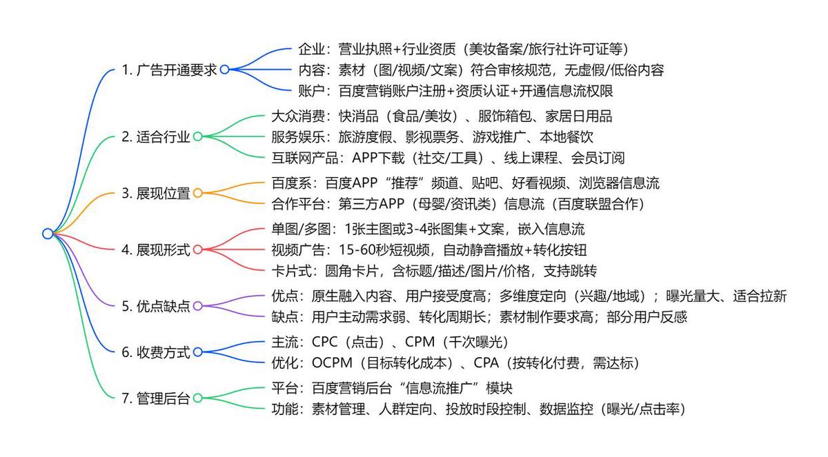 百度常见的广告除了大家熟悉的搜索推广,信息流推广,还有电商推广(包括百度健康商城)、本地生活(百度地图+惠生活)、爱采购(批发)、品牌广告六种广告形式,接下来会按照他们的广告开通要求、适合的行业,展现的位置,展现的形式、优点缺点、收费方式、管理后台等来给大家详细介绍。