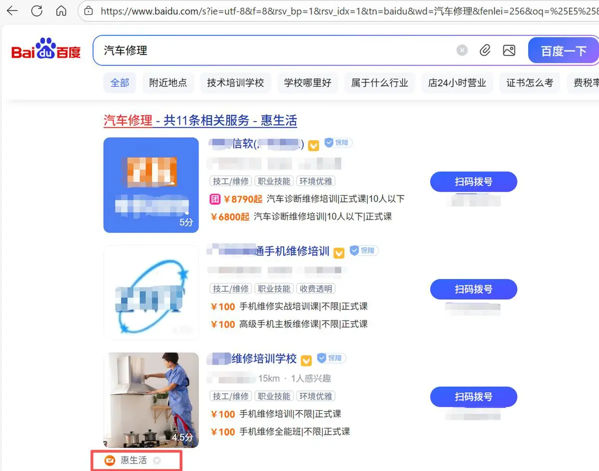 流量入口较多,本段第一张图为百度PC(电脑端)搜索的惠生活展示的位置,但这只是其中一个流量入口。更多流量入口可见本段的第二张图(本地生活:惠生活+百度地图)。
