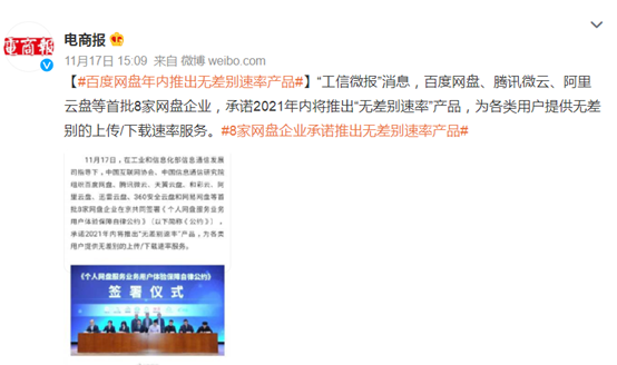 11月17日,百度网盘、腾讯微云、天翼云盘、和彩云、阿里云盘、迅雷云盘、360安全云盘和网易网盘等首批8家网盘企业共同签署《个人网盘服务业务用户体验保障自律公约》,承诺2021年内将推出“无差别速率”产品,为各类用户提供无差别的上传/下载速率服务。