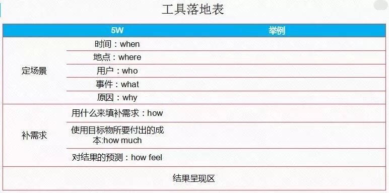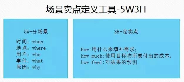 同一个需求在不同场景下,用户诉求不一样,用5W来定义场景,用3H来分析卖点,将产品的卖点对号入座到用户诉求中,进行满足。