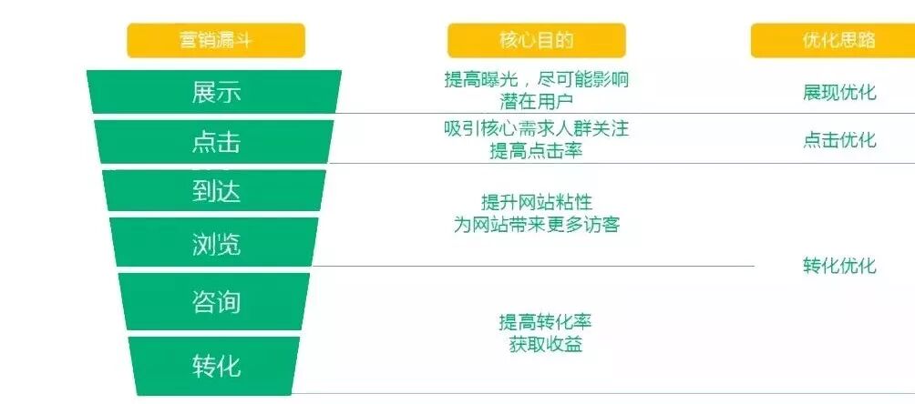 漏斗的六层对应了营销的各个环节,通过营销漏斗可以反映出从展现、点击、到达、浏览,咨询直到生成订单过程中的客户数量及流失。从最大的展现量到最小的订单量,这一层层经历了推广、网址、销售等三个阶段,不断缩小的过程表示有网民因为各种原因离开,失去兴趣或放弃购买。通过分析网民流失率最高的阶段,找到问题,进而提升转化。
