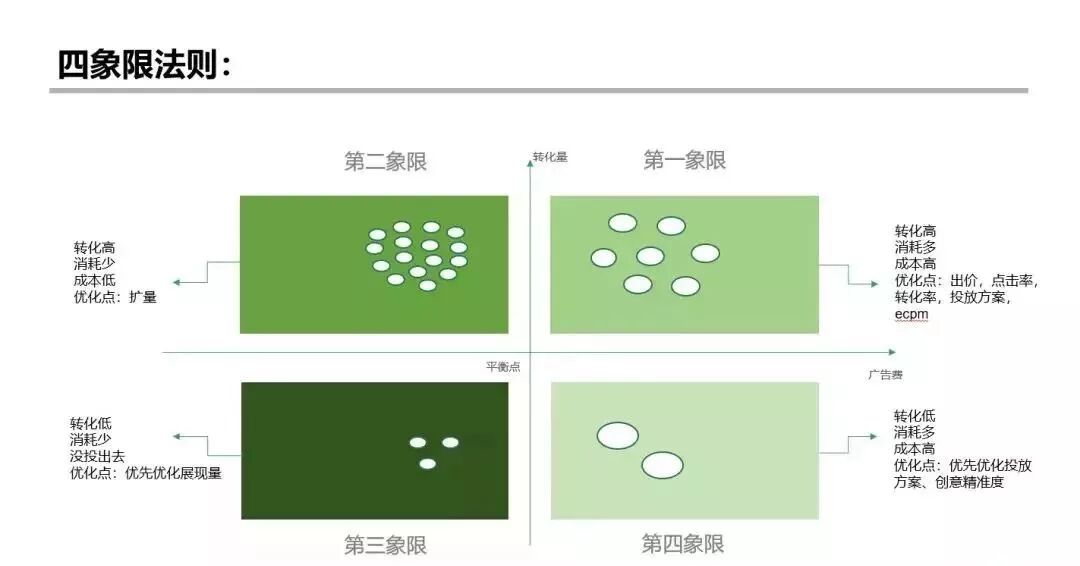 在这个四象限法则里,横坐标代表着我们的广告费用消耗,纵坐标代表着广告产生的转化量,我们逐一来看:
