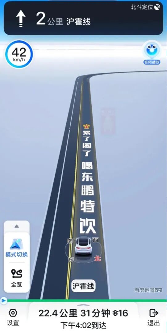 从网友分享的截图中可以看到,在行驶至沪霍线途中 ,百度地图导航界面突然出现某饮料广告的9个汉字,文字铺满了导航界面中虚拟的前行车道。
