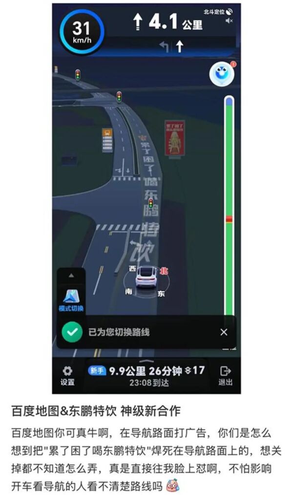 目前,网络上仅曝出百度地图插入了东鹏特饮的“车道广告”。记者就此情况联系了东鹏饮料(集团)股份有限公司,工作人员表示,暂不清楚相关情况,正在向相关部门核实。
