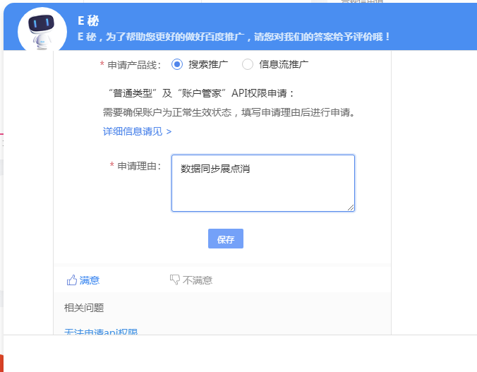 输入文字“申请Api权限”,聊天对话框会显示申请会话内容,用户在选择了所需开通的产品线,并写上申请理由后,点击确定。系统就会自动判断当前账户是否符合开通要求,若符合会开通,不符合会说明理由。注意:
