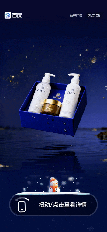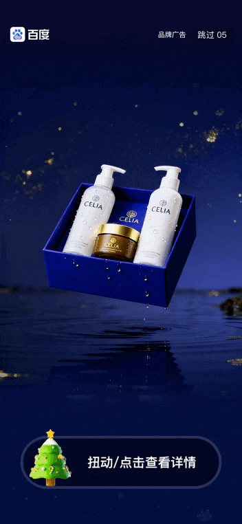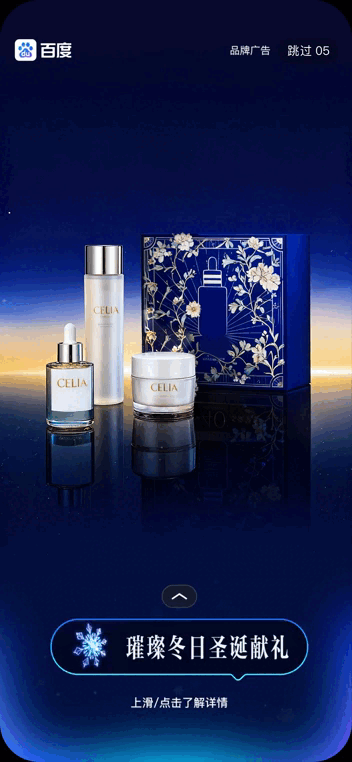 在开屏5秒视频播放过程中,用户产生交互即自动迸发惊喜彩蛋,给用户“开屏即惊喜”的视觉享受,将品牌产品图、品牌slogan等信息在彩蛋中进行二次曝光,加深用户印象和品牌互动感;同时,支持自定义品牌产品图、品牌logo、品牌slogan等,品牌可深度定制;在百度APP、百度地图、百度网盘、百度贴吧、好看视频上均支持使用圣诞开屏创意动效。