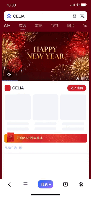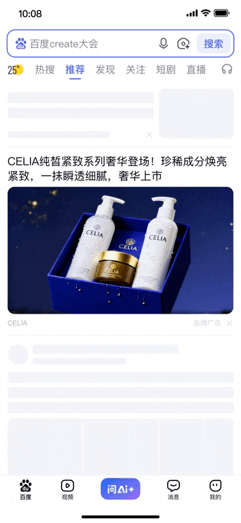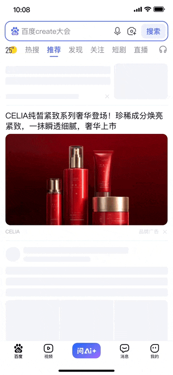 在百度APP首页推荐信息流、用户主动搜索结果页这两大场景,延续开屏新年元素,统一氛围视觉,给予用户连续性、故事感的沉浸式观看体验,促进用户与品牌深度交流。