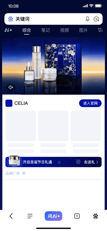 通过彩蛋、强入场动效等创意交互,打造沉浸式体验,在强化品牌认知的同时,有效提升转化;同时,品牌百看也支持强入场动效,以深蓝通顶色营造节日氛围;搜索彩蛋需下单炫动品专,且提前7天沟通;强入场渐进增强、品牌百看样式需提前21天沟通。