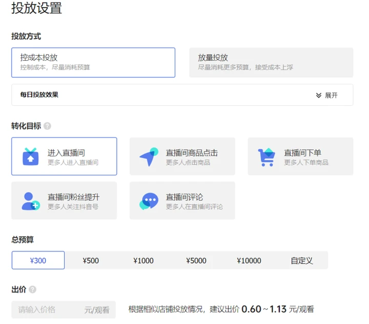 其中每部分还涵盖若干明细维度可供选择设置,支持投放方式、转化目标、预算及出价、达人粉丝定投、行为兴趣定向等多个关键要素,从而Zui终达到精细化投放的目的。