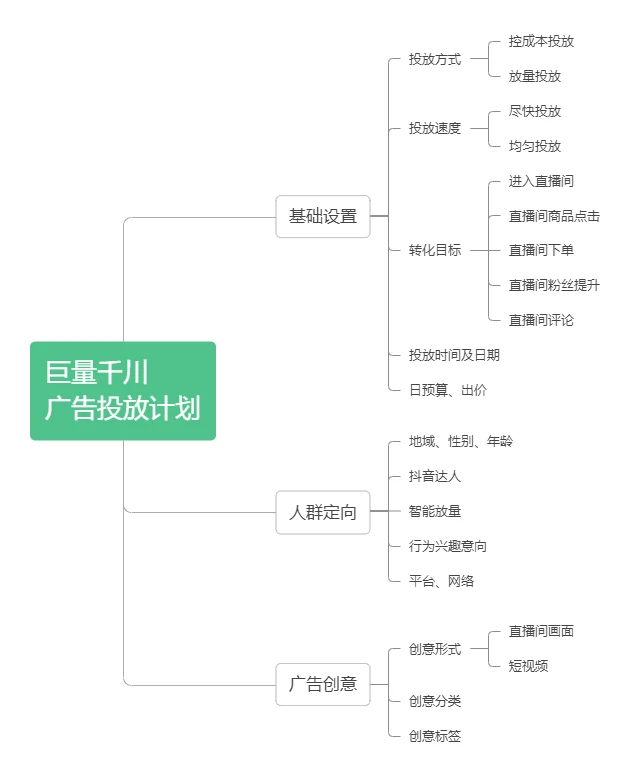 在开始搭建千川投放计划之前,我们先从下面这张思维导图了解下千川投放计划的整体框架。主要分成三部分:基础设置、人群定向、广告创意。