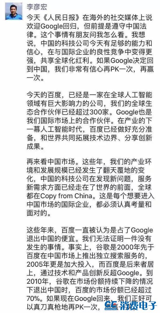 2018年8月6日,李彦宏更是在其朋友圈表示道:“如果谷歌重返中国,百度非常有信心再赢一次。”