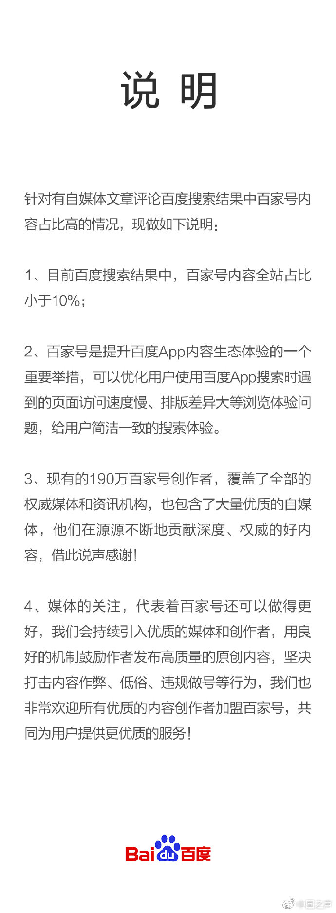 百度副总裁沈抖在昨天(23日)举行百家号2019年内容创作者盛典上更用“问心无愧”一词来回应质疑,他进一步指出,文章所说的百度被营销号充斥,是不准确的。