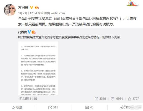 针对百度方面的回应,《搜索引擎百度已死》作者方可成昨天通过微博上表示,“全站比例没有太多意义,大家搜索一般只看前两页。如果能给出第一页的结果占比会更有说服力。”