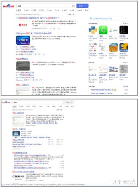 我们看下在没有插件和安装完插件之后的对比,可以看到搜索编程之后,满屏都是竞价广告;而360浏览器连侧边的广告都没有了。