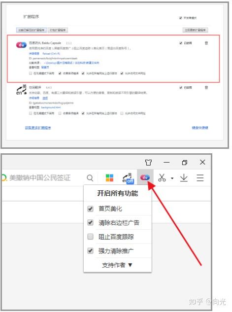 这时插件就会成功安装,浏览器左上角也会出现插件的开关图标。可以看到这款插件有美化、去广告、阻止追踪和清除推广几个功能,大家结合实际开启即可。
