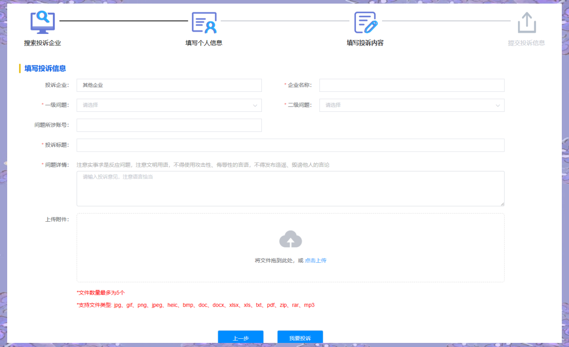 在提交投诉之前,你需要提供一些个人信息,以便平台或企业能够联系你并处理你的申诉。这些信息通常包括你的姓名、联系方式以及可能的电子邮件地址等。确保你提供的信息准确无误,以便能够及时收到处理结果和回复。