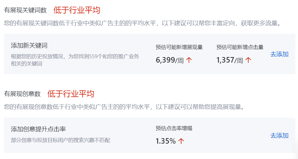 检查账户是否有出价过低、匹配过度、生僻冷门词等,拉低了展示关键词数,调整优化,提升该指标。