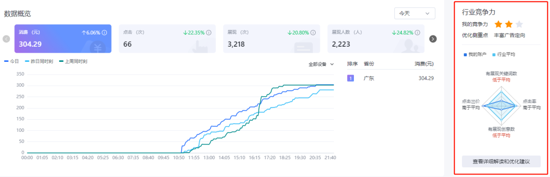 行业竞争力分布在数据概览的右侧,非常清晰,便于时刻掌控大盘的数据,广告竞争力情况也一览无余。竞争力的数据维度为近7天均值,数据周期近,指导意义强。