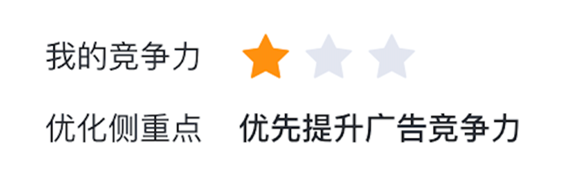 竞争力细分为有展现关键词数、转化出价、转化率、有展现创意数、点击率、点击出价”六大维度,系统给出了我的广告竞争力星级,并给出了优化侧的重点。
