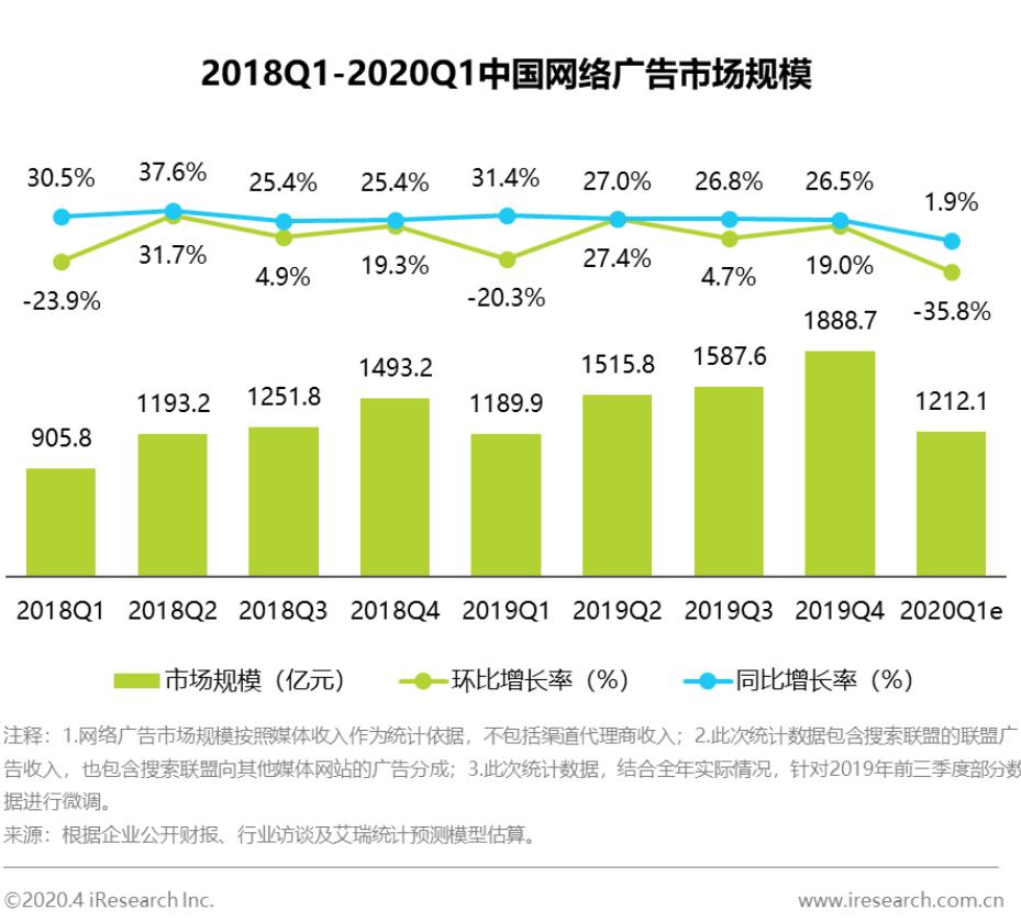 作为对比,2019年全年中国互联网广告市场的增长率为18.2%,从这个意义上,Q1这个1.9%的增速代表这疫情为互联网广告的增长按下了暂停键。