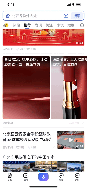 为最大化品牌曝光效能,打通百度APP开屏、信息流两大核心资源位,通过“开屏首曝+信息流二次触达”的组合策略,延长品牌曝光时间与用户互动链路。在开屏与信息流视频联动场景下,全面升级产品能力,系统将根据用户打开APP后默认进入的页面(推荐页/发现双列页/视频页),智能匹配三种适配性联动样式,实现“资源无缝衔接、样式动态适配、体验丝滑升级”,助力品牌在用户路径中高效渗透。