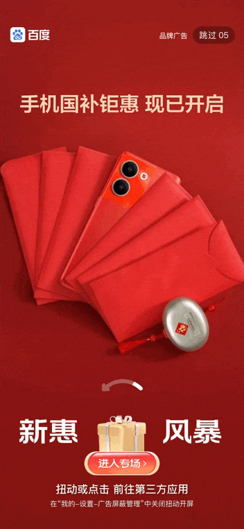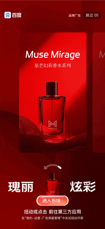 为满足不同行业品牌的深度营销诉求,推出开屏品牌定制样式,将品牌核心产品与动态交互体验深度融合。通过将品牌产品定制设计为交互动效,结合两侧悬浮品牌Slogan的强互动布局,确保用户视线焦点不偏离;同时开屏交互后触发2秒产品彩蛋,进一步强化用户心智,实现“产品可视化+品牌心智穿透+高价值互动”三位一体营销目标,让品牌信息传递更精准、更生动。