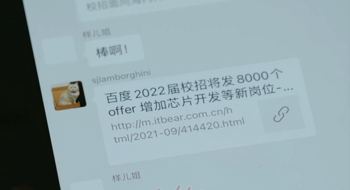 开篇镜头就是轻松生活化的画面,代入感满满。一个毕业生女孩从微信打开百度“会发光的人”的招聘链接,带着好奇心发问“会发光的人是什么样子”,瞬间抓住了受众的注意力。