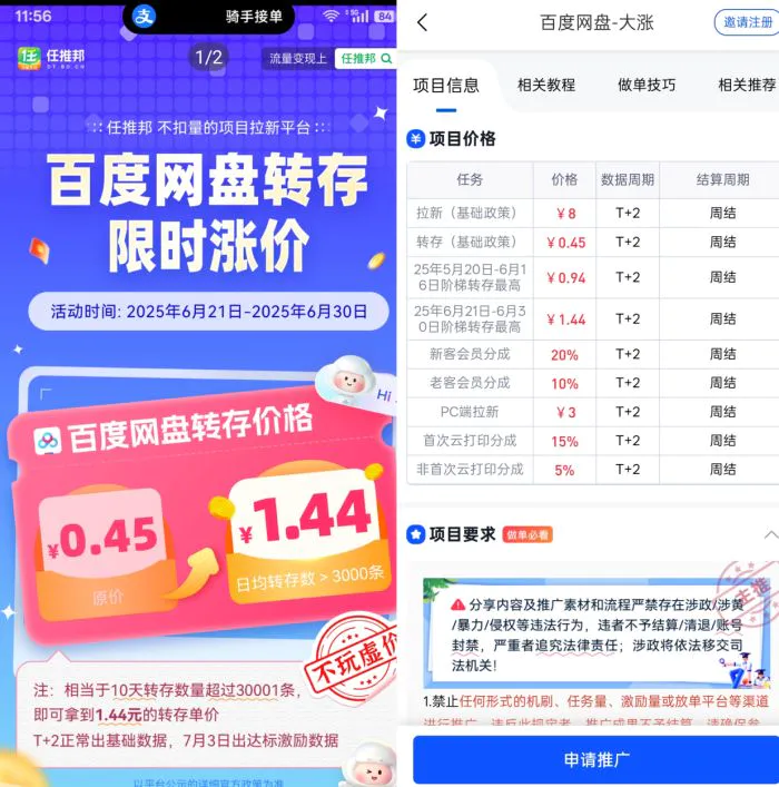 百度网盘拉新业务是正规真实的大前提下,我们还需要对接靠谱的一级服务商机构才能真正做到万无一失,小编推荐极具实力的老牌机构【任推邦】,这也是目前互联网上的头部网盘推广机构,可以称得上好评如潮!任推邦官方邀请码15527649518,免费注册使用没有任何套路,任推邦有100万体量而且运营时间达到3年,背后是国家AAA级重合同守信用企业,所以也被称为不扣量的拉新认为平台!